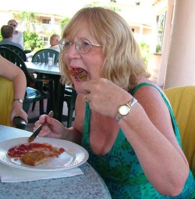 This is Kath having a snack... she had intended going for a plodge in the sea but it started raining.....and she didn't want to get wet... Notice the time on Kath's watch..it's the same time as on the first picture, proving that Kath has been eating this meal for 24 hours...a record, even by her standards
