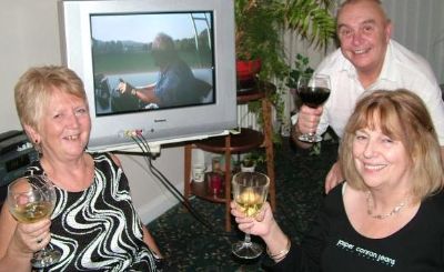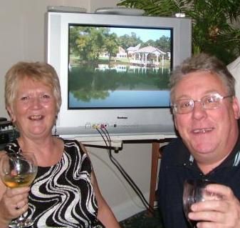 Here we are back hyem, drinking wine and watching our adventure, all captured on 3 hours of video. Look carefully at the TV and you'll see King Nautical at the helm of his craft