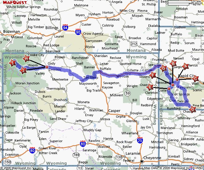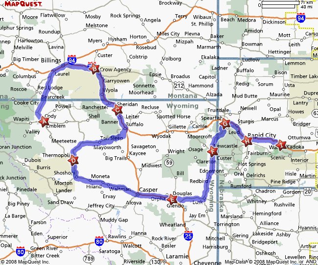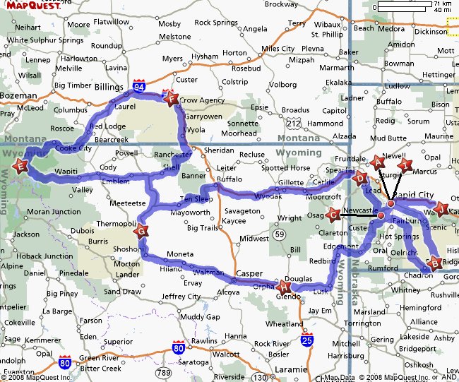Here's a recap from Cody..we went North into Montana for the Little Big Horn, then Sheridan, Thermopolis, Douglas, Newcastle, Spearfish, Rapid City and on Wed 24th we went east to Wall and the Badlands